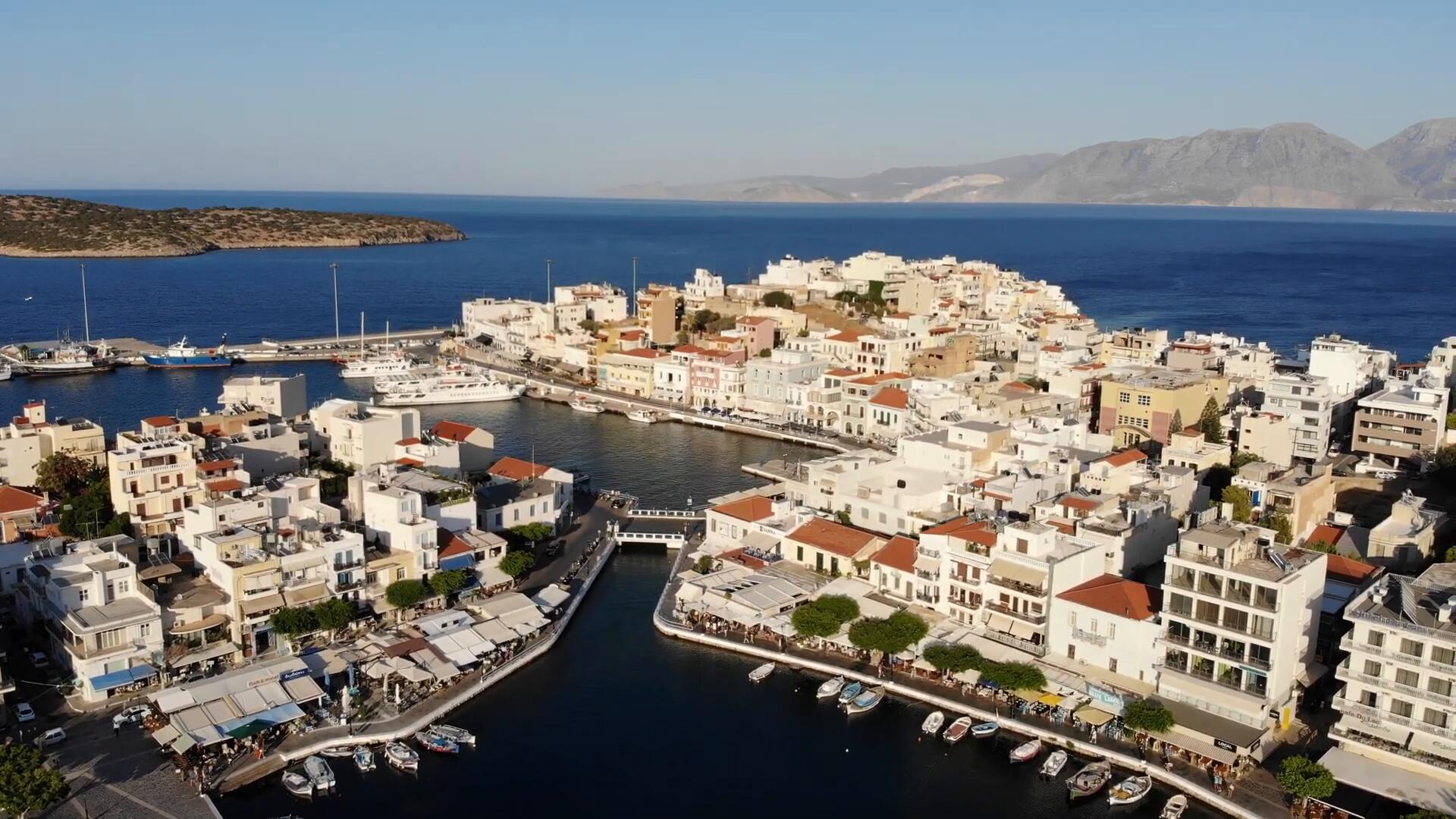 Греция, Крит, озеро Артемиды с высоты птичьего полёта 4К видео озеро Вулисмени, Айос Николаос.