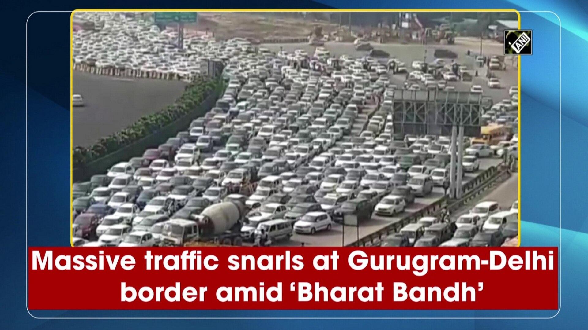 Massive traffic snarl seen at Gurugram-Delhi border as vehicles entering the national capital are being checked by Delhi Police and paramilitary forces, in wake of ‘Bharat Bandh’ called by farmer organisations on September 27. Bharat Bandh has been called by Samyukt Kisan Morcha to mark the first anniversary of the enactment of the three farm laws.