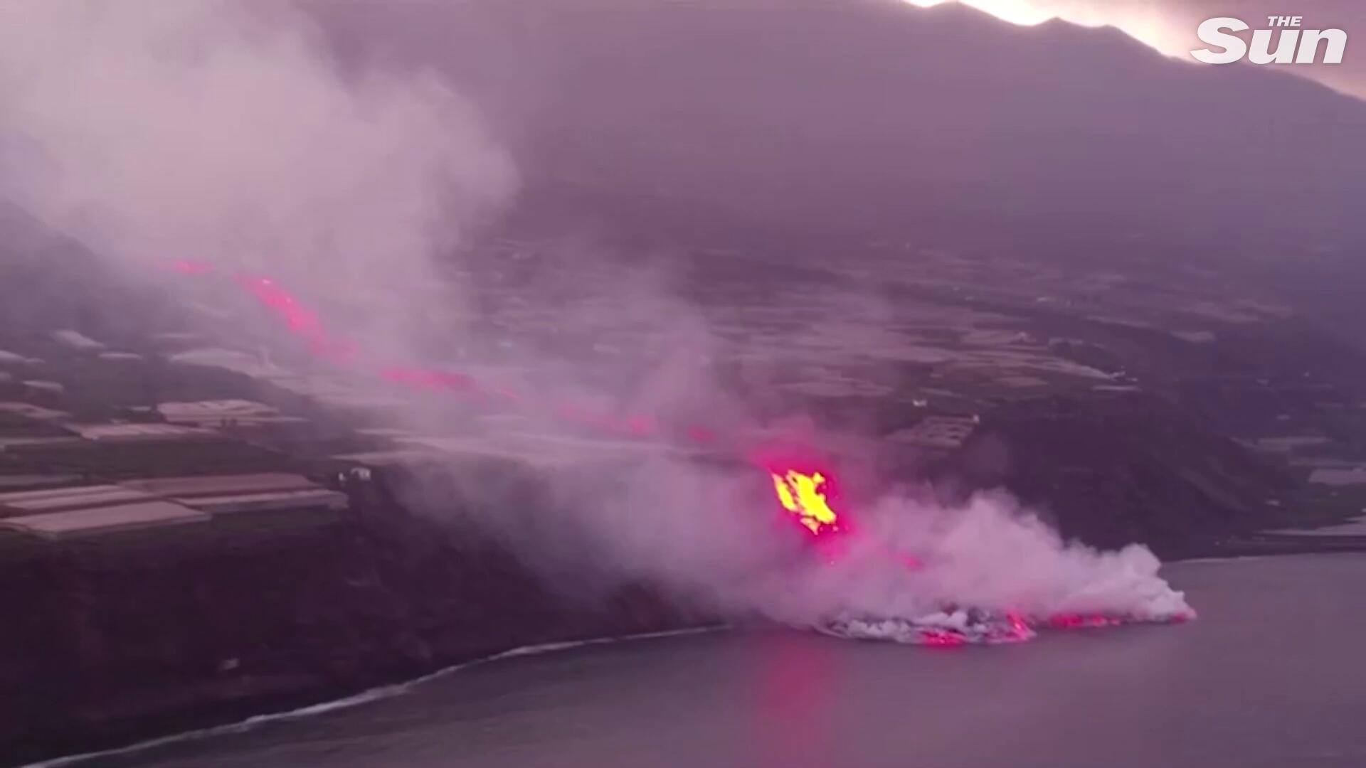 Spectacular drone footage captures lava from La Palma volcano crashing into ocean