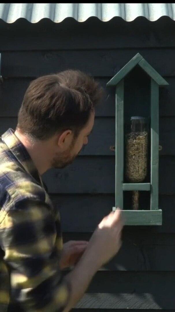 This guy decided to make a feeder to attract birds into his garden using an empty wine bottle and pallets. He first used pallets and cut them into different shapes to make a miniature hut. He then filled the bottle with feed, placed it upside down inside the hut, and finished his artwork.