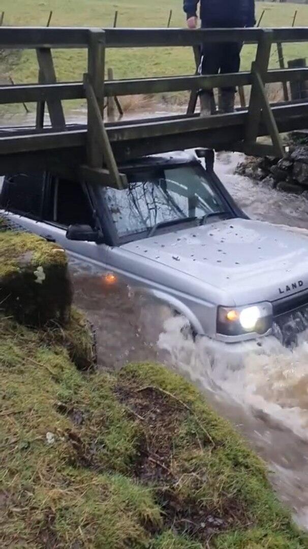 This person was attempting to drive their car in a shallow stream of water. However, soon a bridge on their way stopped them from moving further. Later, they realized that the tall car got stuck under the bridge due to its height.