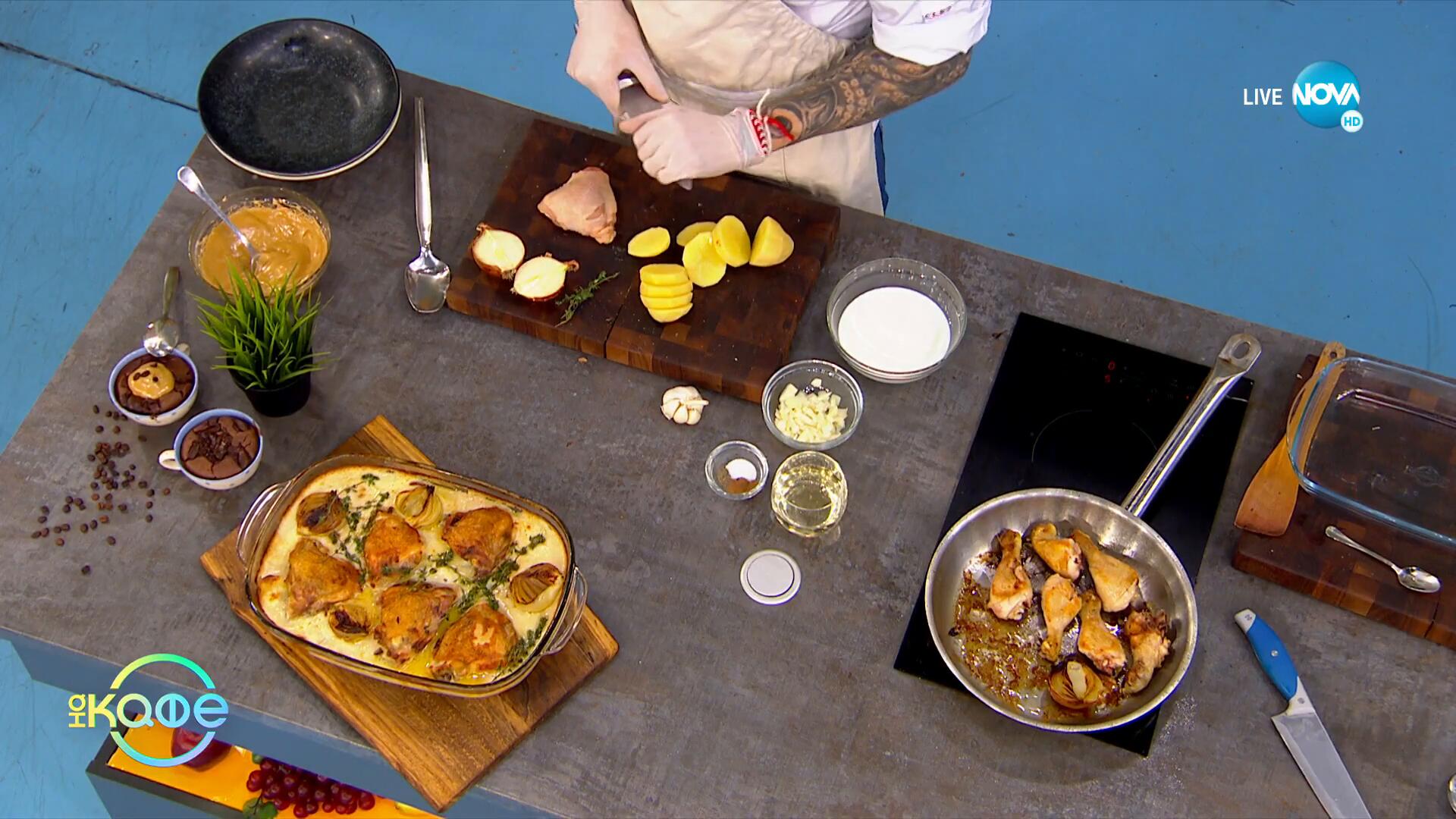 Пиле с бял винен сос, картофен гретен и карамелен лук и Шоколадов мъгкейк, банан и овесени ядки