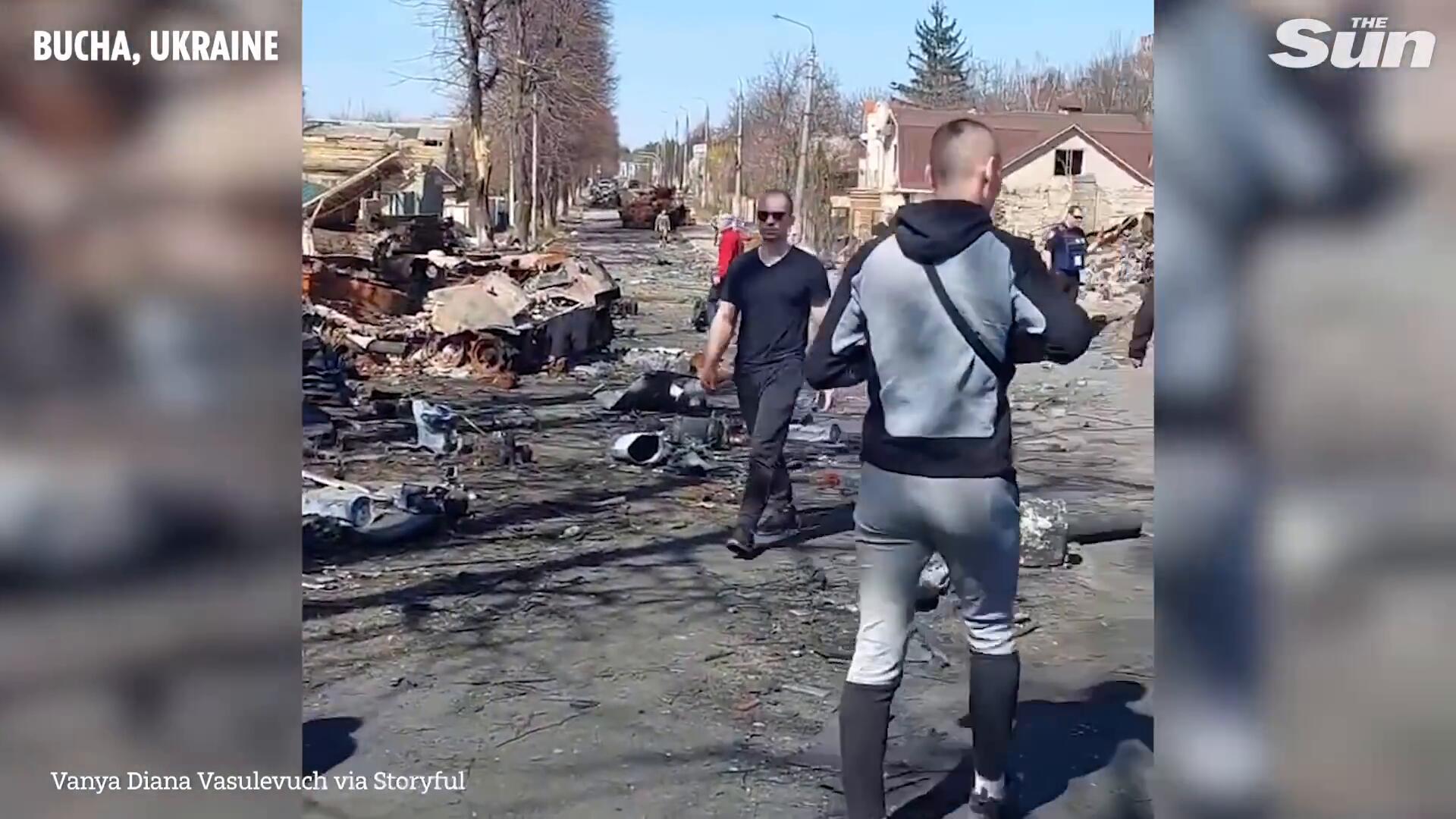 Destroyed Russian column seen on street in Bucha, Ukraine