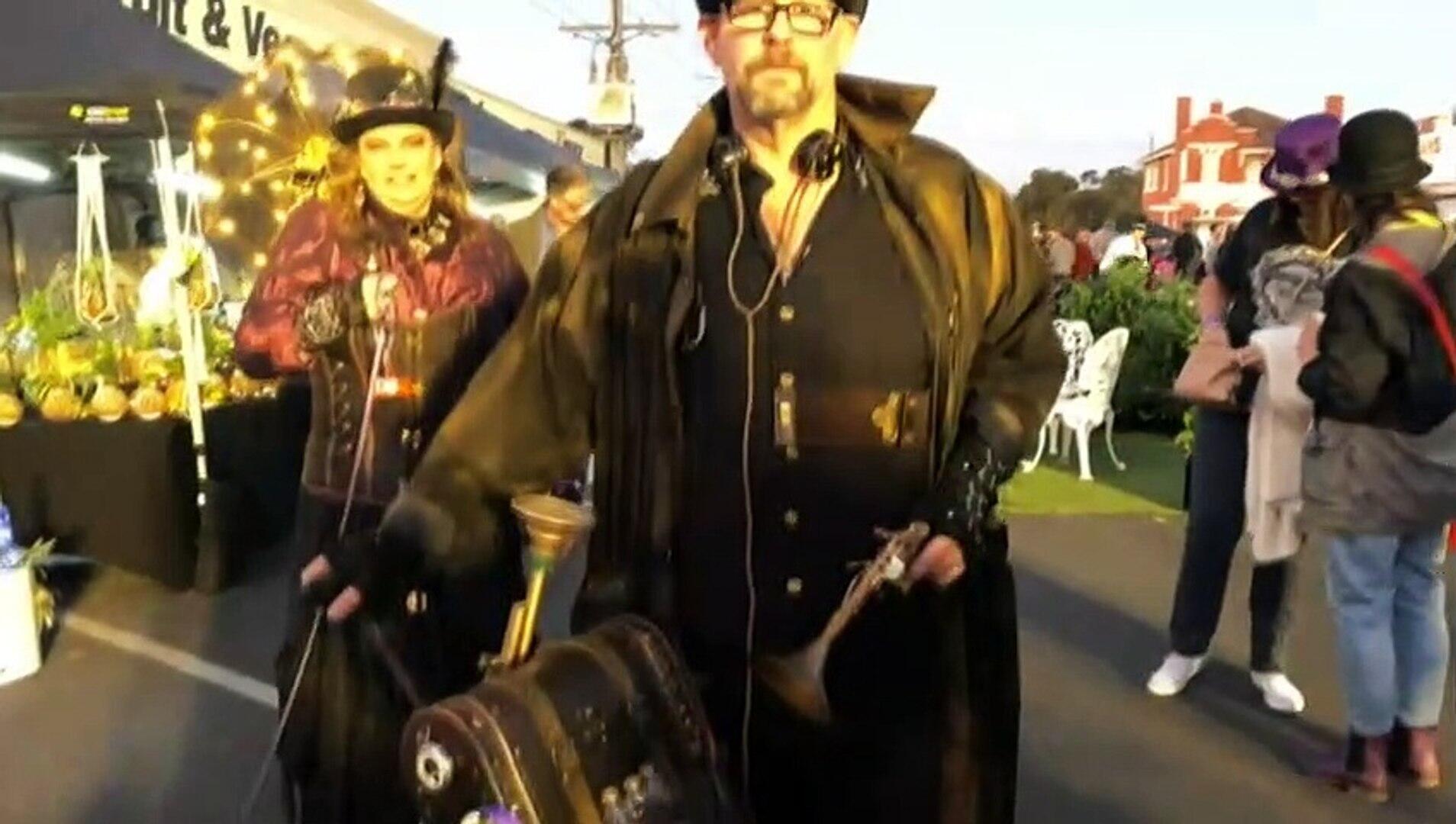 Thousands of costumed cos-play devotees have descended on a remote community in western Victoria as it seeks to drag itself out of the economic slump caused by the pandemic. The tiny Wimmera town of Dimboola was last night transformed for it's first steampunk festival - a form of cos-play that melds the past with the future.