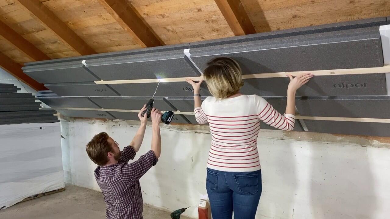 Hier sehen Sie die Verarbeitung der alpor Untersparrendämmung für alle Arten von Dächern. Diese Dämmung kann auch für Dächer mit mit Kunststoff-Folien verwendet werden. Eine Besonderheit unserer Dämmstoffe ist eine sehr gute Dämmwirkung. Bei gleichem U-Wert können unsere Dämmstoffe 8-10cm dünner bleiben. Ein weiterer großer Vorteil ist unser sommerlicher Hitzeschutz. Dieser ist doppelt so hoch wie z.B. von Mineralwolle ( 20cm alpor Dämmung entsprechen 40cm Mineralwolle ). Unsere Dämmstoffe emittieren keinerlei Feinstäube oder Schadstoffe und jucken natürlich bei der Verarbeitung nicht.