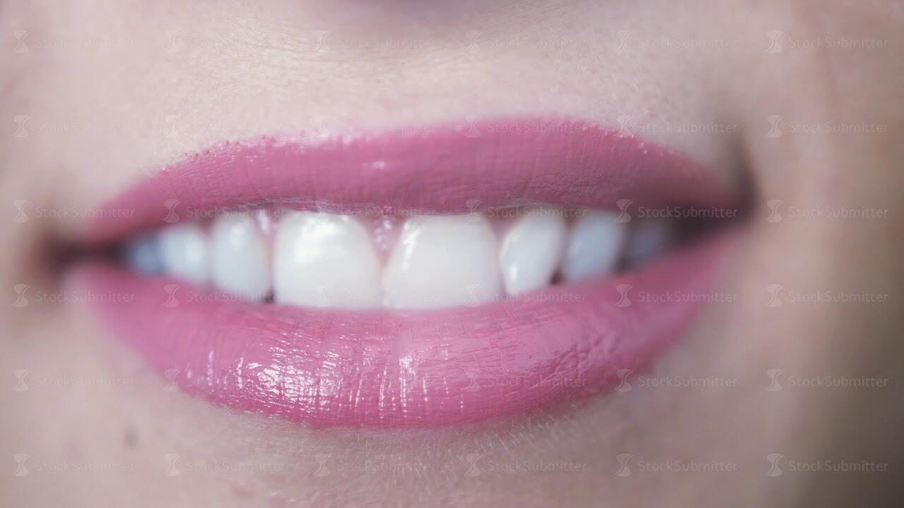 Close up of beautiful smiling pink lips of young girl with open mouth and teeth. 3840x2160