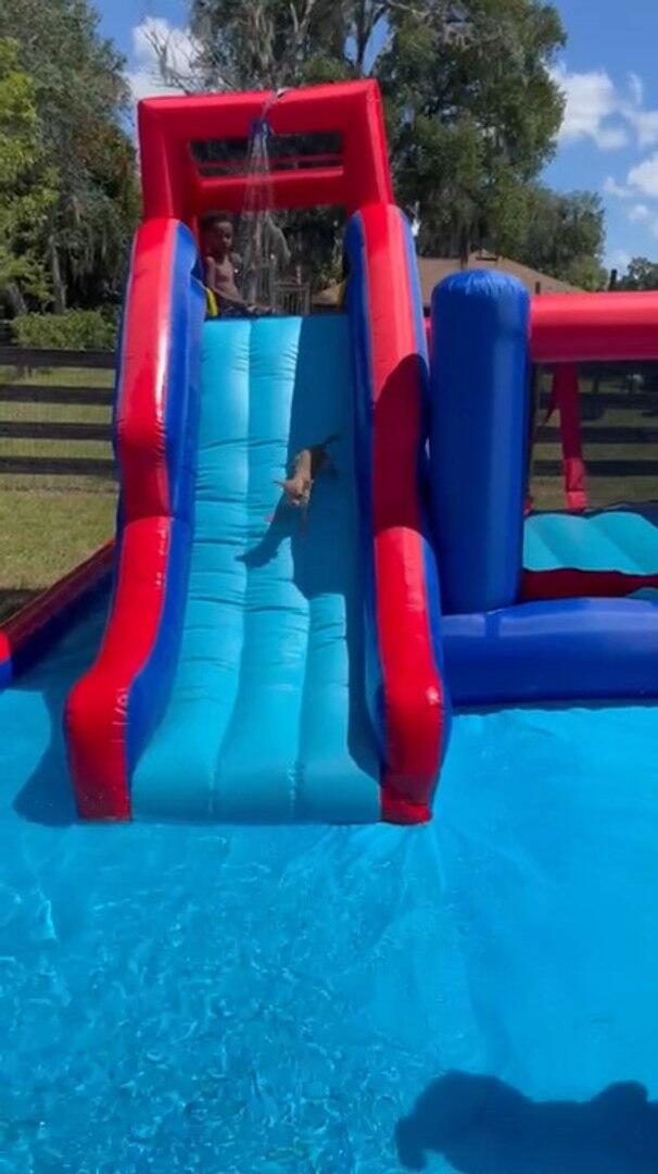 Although hesitant at first, Kash the Chihuahua puppy mustered up the courage to slide down the slide into the kiddie pool following his little human friends.