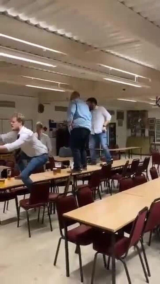 During a party at a rugby club, this drunk guy decided to show off his dance moves on a table but ended up with a hilarious fail. Everything was fine until someone asked him to get down. That's when he fumbled and slipped off the table instantly.