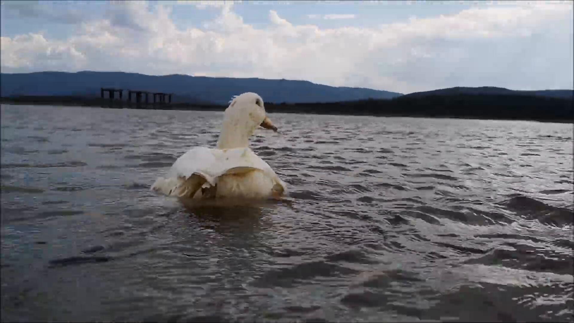 Duck is surfing the waves on a windy and cloudy Summer day