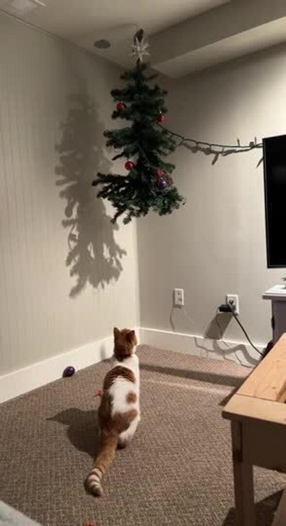 Oliver the cat loved to climb Christmas trees, so to keep him away, his owner hanged one from the ceiling. But the suspended tree still couldn't stop Oliver from climbing on it. The amusing cat observed the hanging tree for quite some time before finally making a leap to hang onto it.
