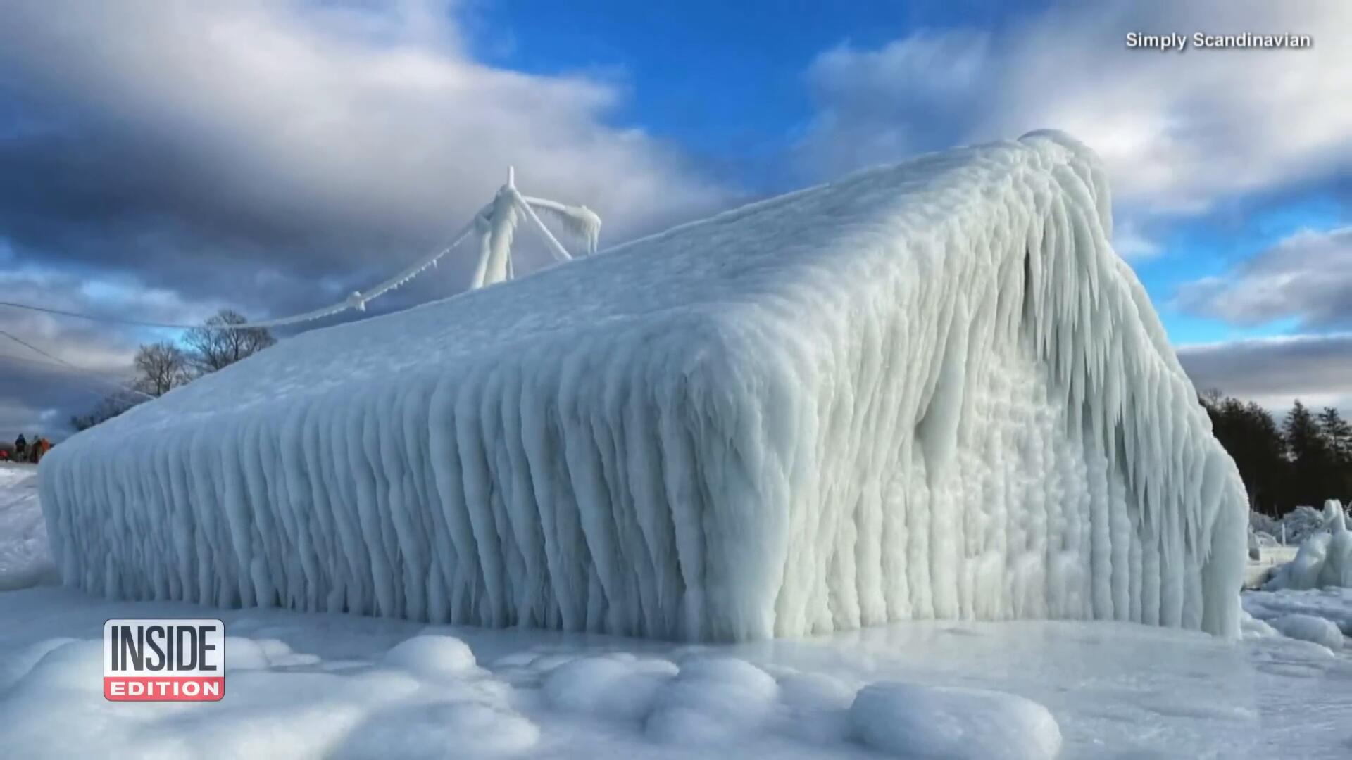 Wind and Waves Cover Lakefront Store in Foot of Ice