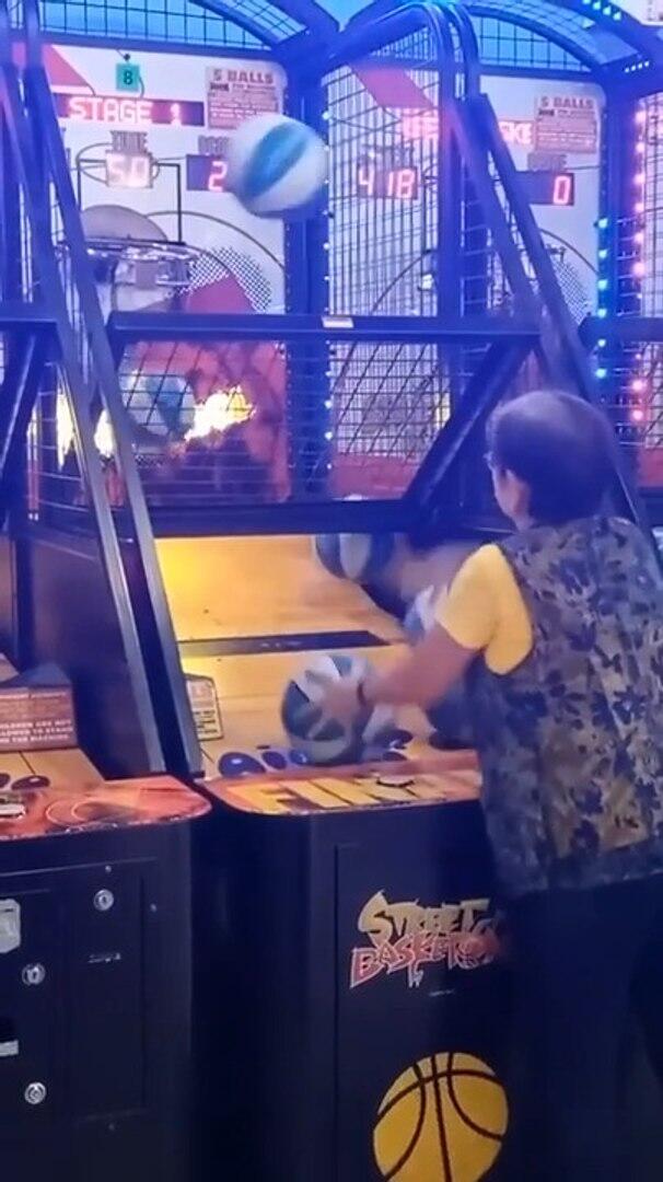 In a basketball game arcade, an elderly woman was breaking all the records. While passersby stared in amazement, she nearly scored on all of the balls with ease.