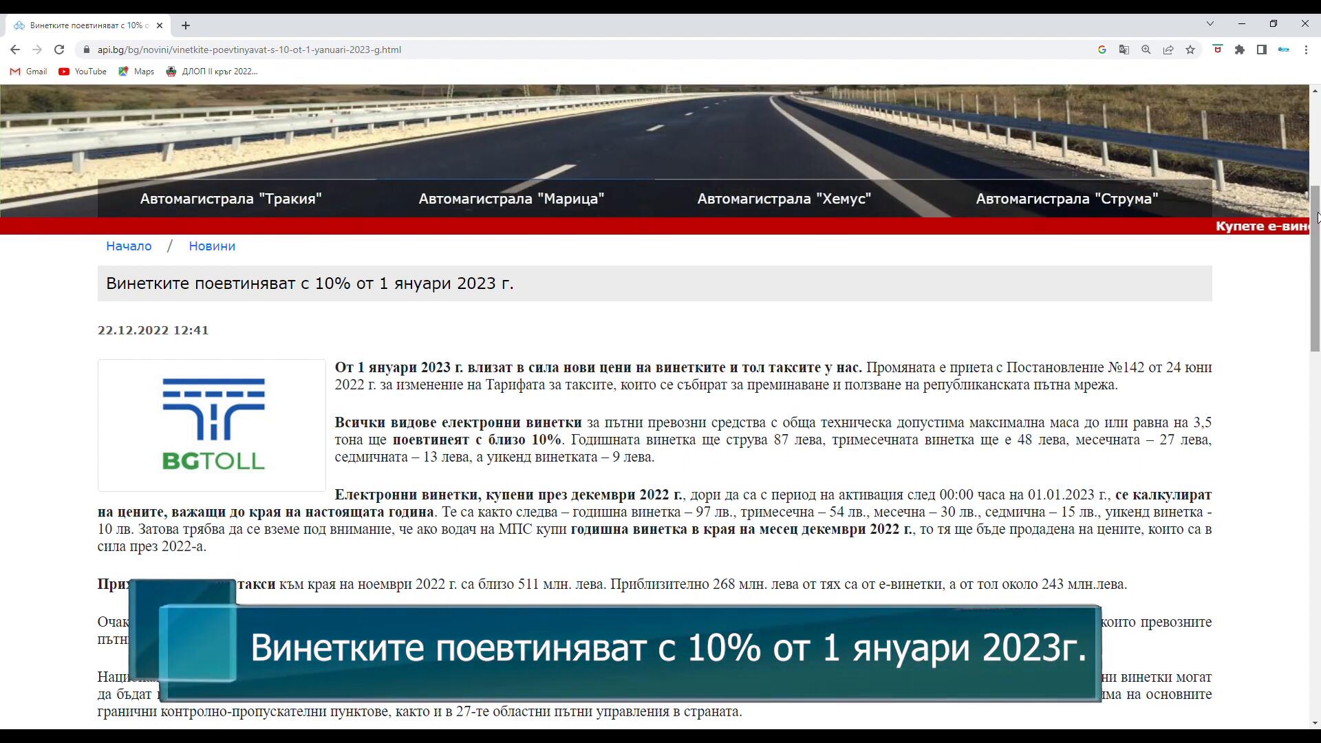 Винетките поевтиняват с 10% от 1-ви януари 2023 година