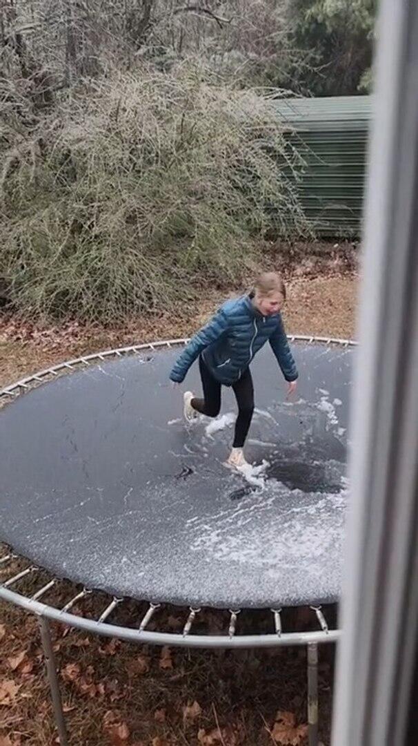 This girl attempted to jump on the frozen trampoline in the backyard. She slipped and tumbled every time she tried jumping on the ice covered trampoline.