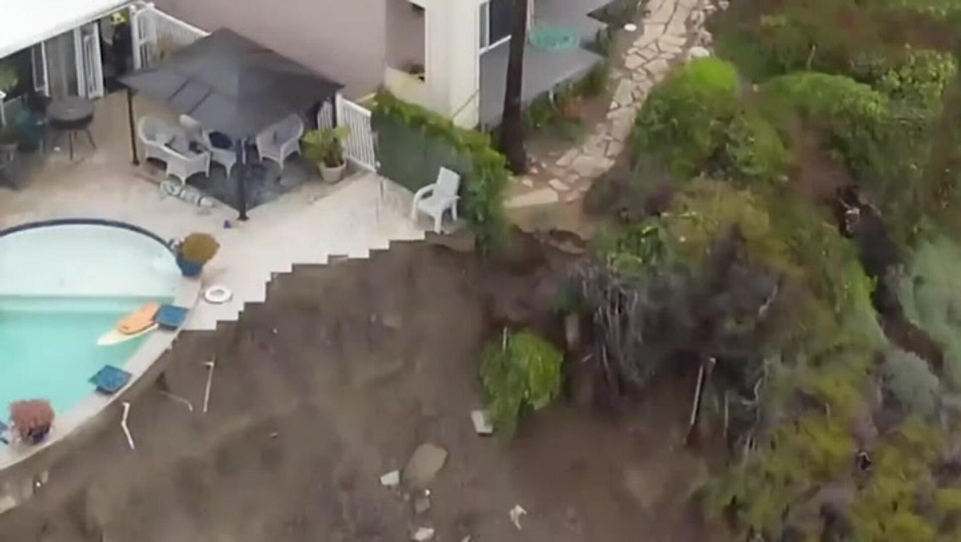 A swimming pool has been left hanging off a cliffside after a landslide on Wednesday in Orange County in Los Angeles. Firefighters arrived moments later and began a search of the homes to ensure everyone was evacuated. Credit: @OCFireAuthority, Twitter