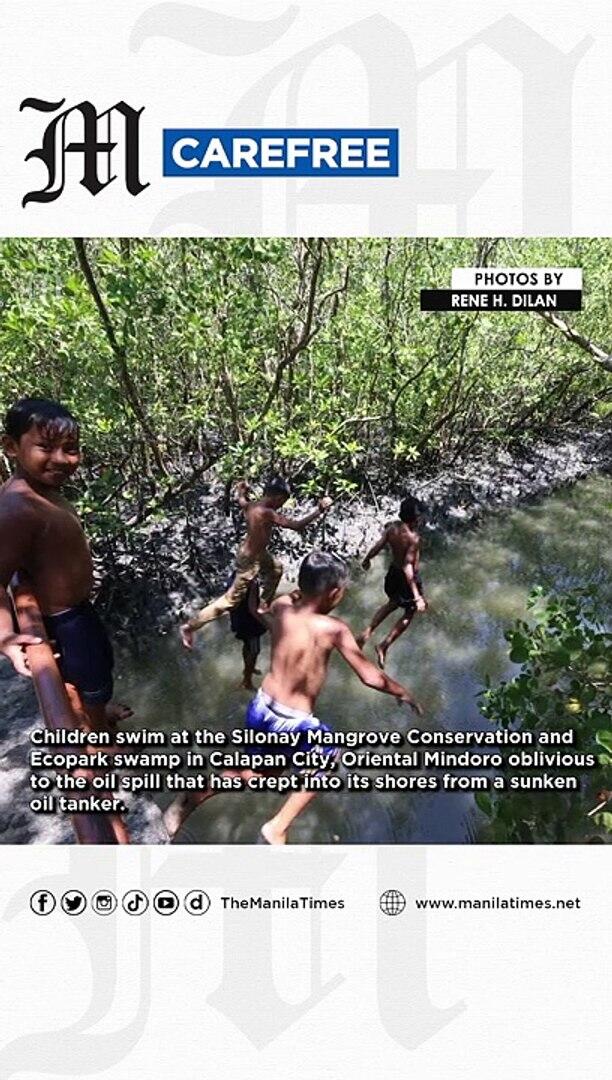 Children swim at the Silonay Mangrove Conservation and Ecopark swamp in Calapan City, Oriental Mindoro oblivious to the oil spill that has crept into its shores from a sunken oil tanker.