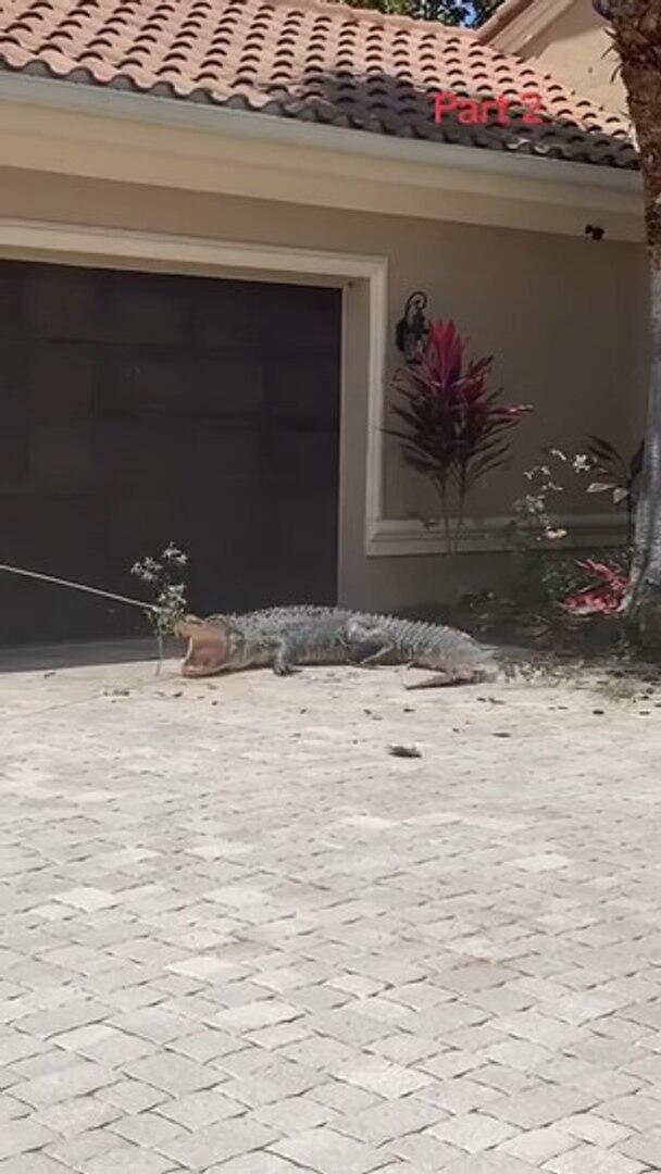 This man attempted to catch an alligator that had wandered into someone's front yard. In an attempt to move the reptile, he hooked a rope to its jaws and dragged it backwards.