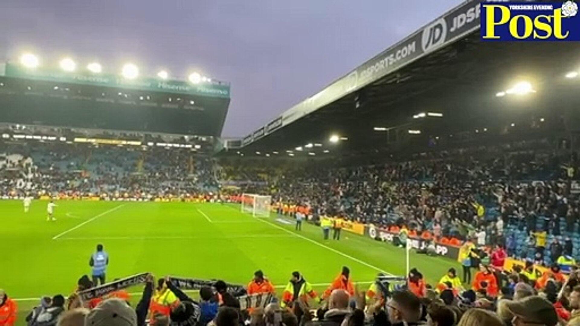 Leeds celebrate yet another win at Elland Road with three cheers from Daniel Farke in front of the Norman Hunter Stand