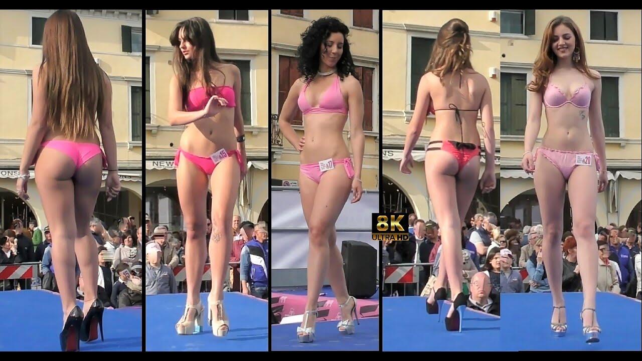 Noale-Venezia. Le splendide ragazze di "Miss Noale" nella loro sfilata in bikini durante una selezione presso la piazza storica del paese.