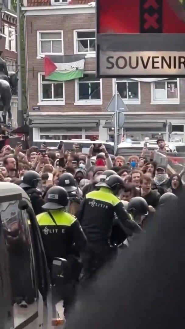 A K-9 police dog attacks a cop at a pro-Palestine protest in Amsterdam