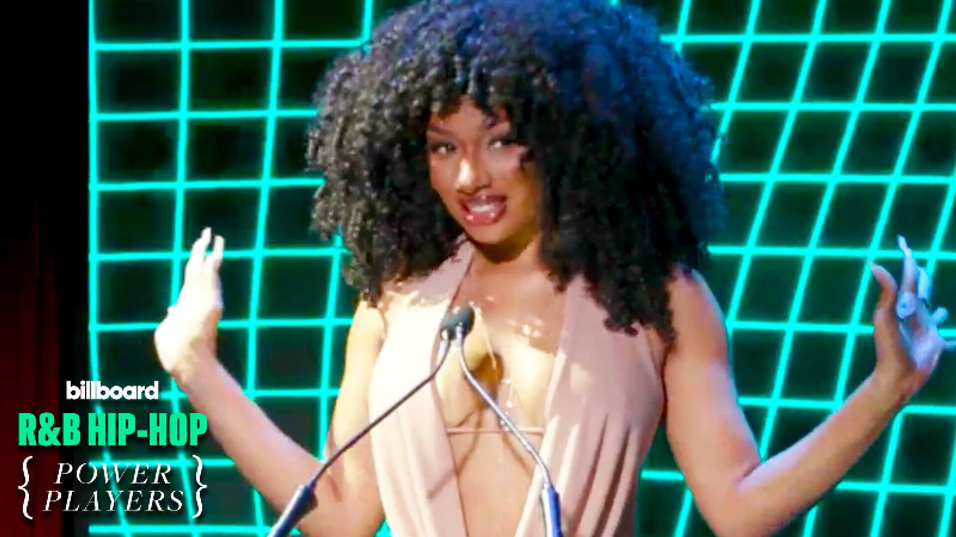 Megan Thee Stallion accepts the Artist Of The Year award from Billboard’s Editorial Director Hannah Karp at Billboard’sR&B Hip-Hop Power Players 2024.