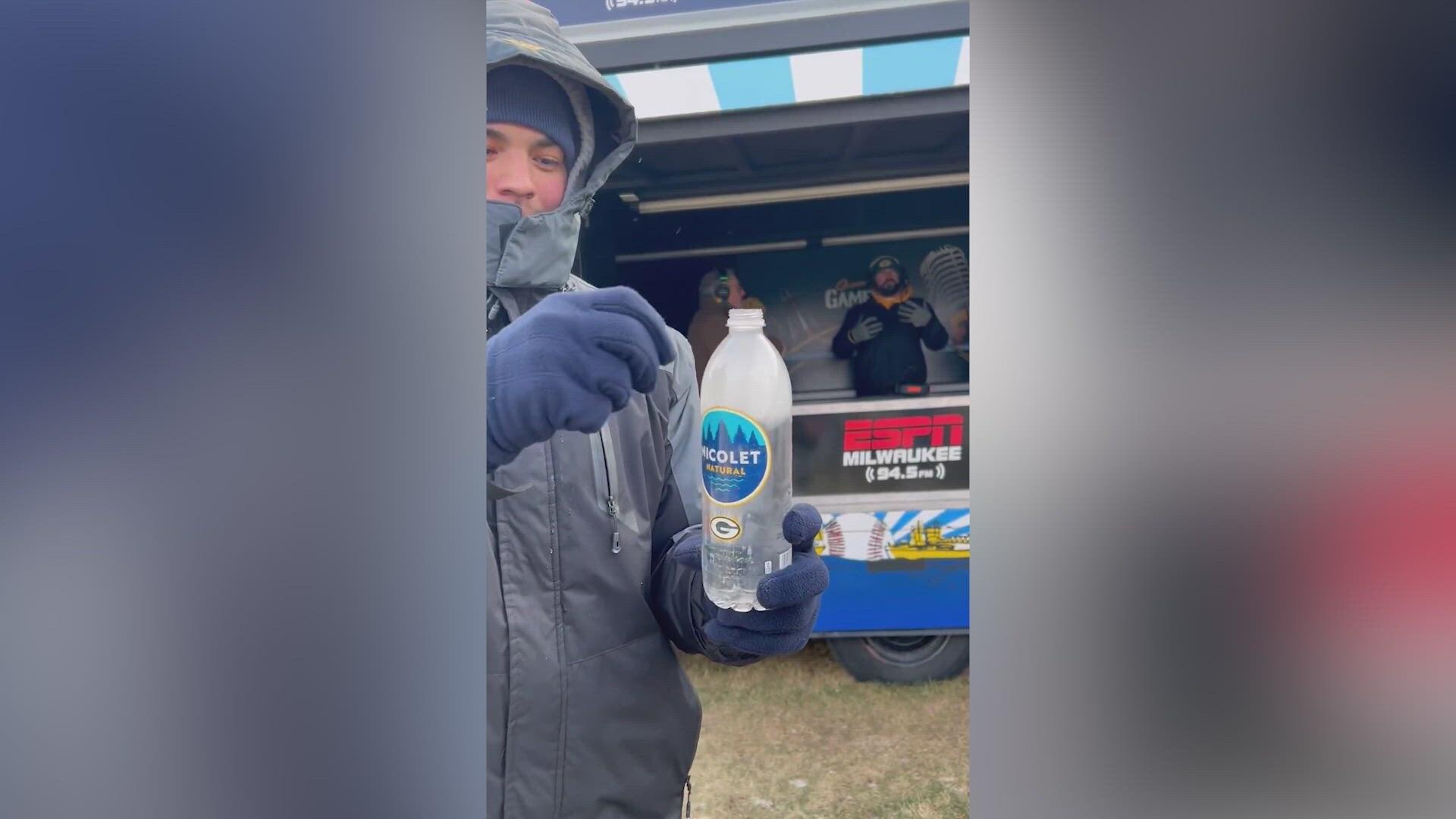 Packers fan opens water bottle to watch it freeze instantly in icy Green Bay weather