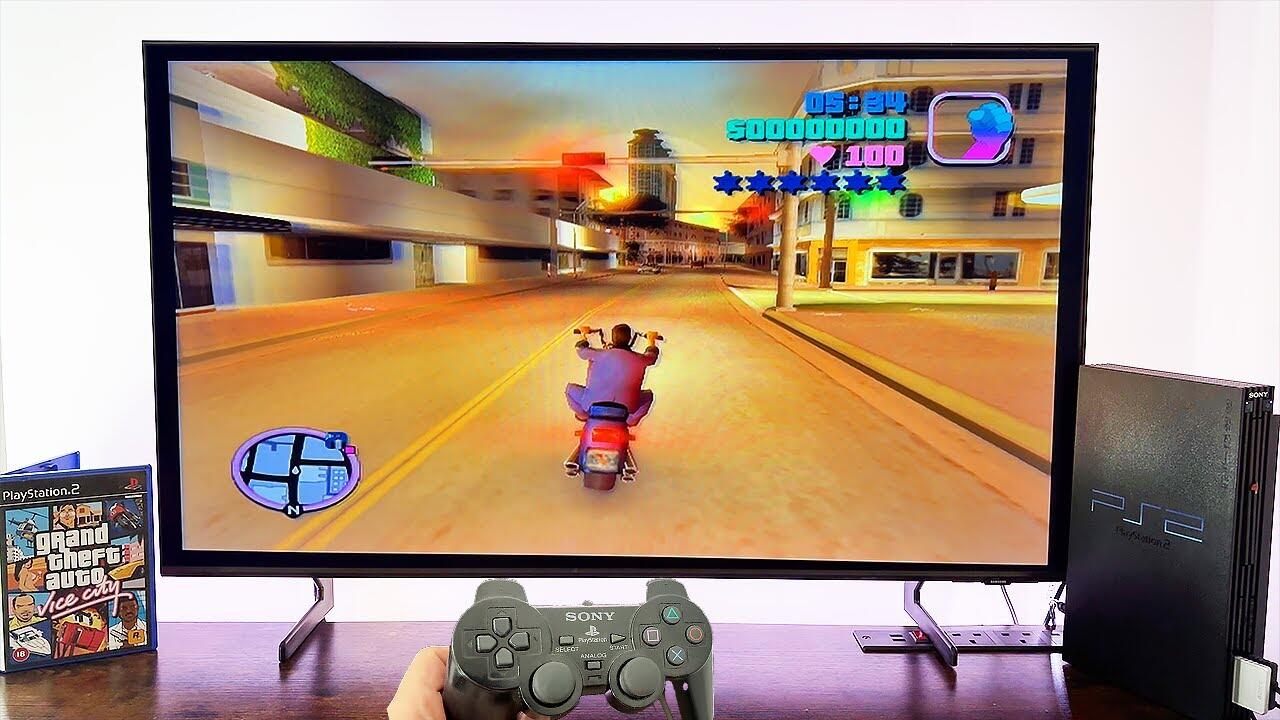 On the PS2, Vice City runs at a native resolution of 480p and targets 30 frames per second (fps). While occasional frame rate dips occur during intense action, the game features detailed environments, dynamic lighting, and an immersive open world, making it one of the best-looking titles of its time.