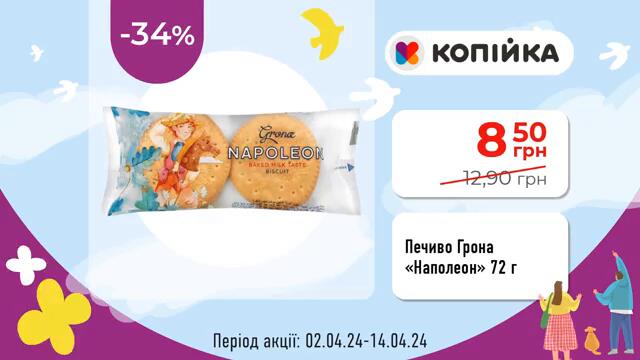 У "КОПІЙКА" ЗАРАЗ ДЕШЕВШЕ: Печиво Грона "Наполеон" 72 г (02.04.24 - 14.04.24)