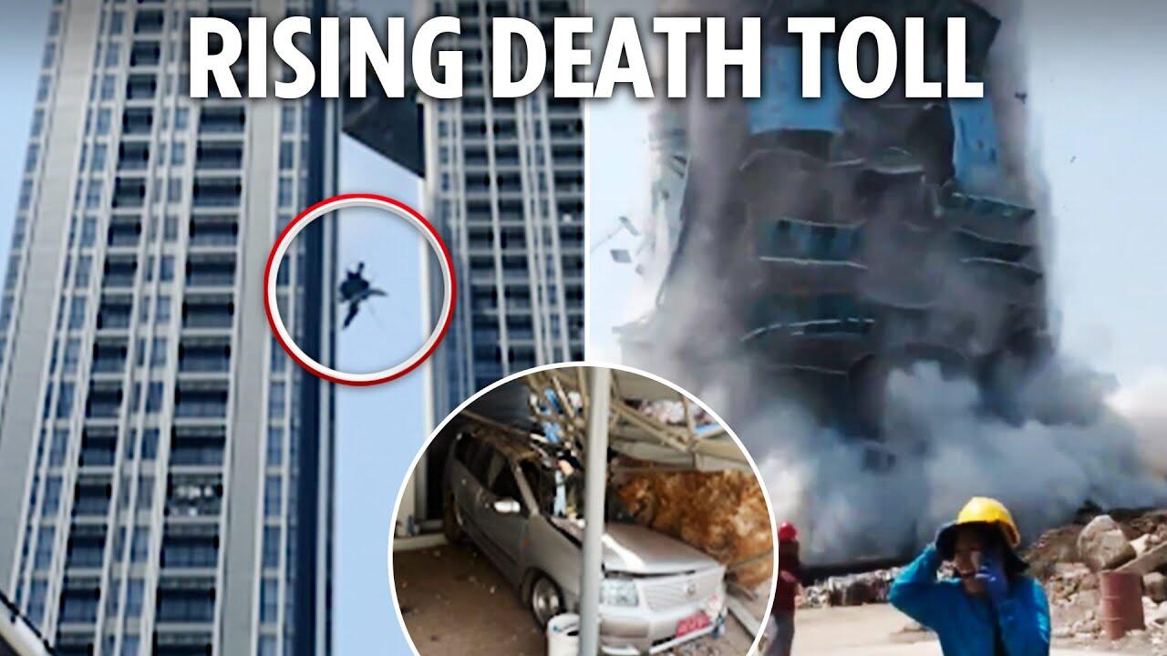 Videos show water gushing from a rooftop pool and a high-rise building collapse as a massive 7.7 magnitude earthquake struck Myanmar and Thailand.