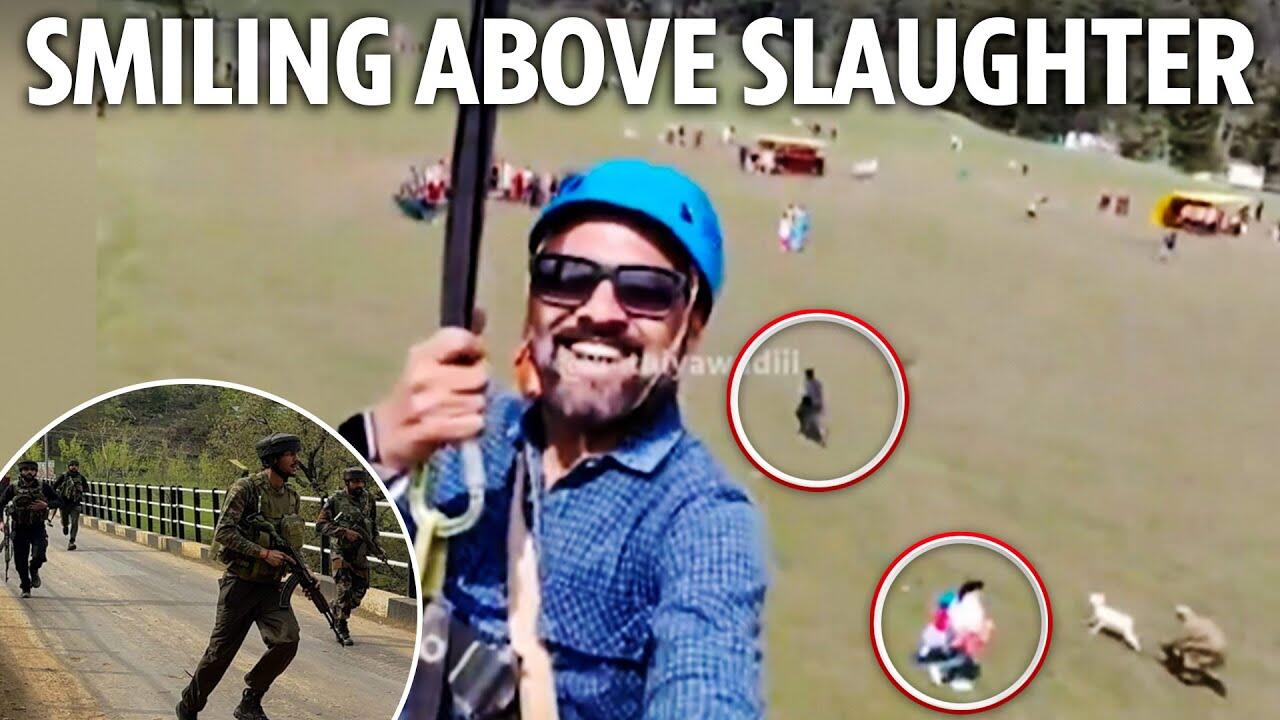 This is the shocking moment an oblivious tourist zip-lines over an ongoing terror attack in Palhagam, Kashmir on April 22nd.