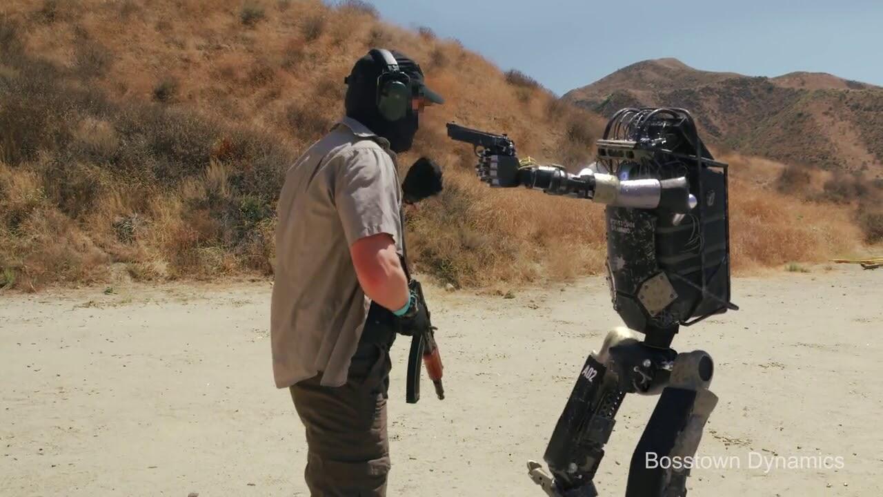 Les nouveaux #robots rendent les #soldats obsolètes ! Découvrez un robot #militaire qui tire sur des cibles, en plein désert, alors que plusieurs hommes (humains) tentent de le frapper ou de le déstabiliser...
