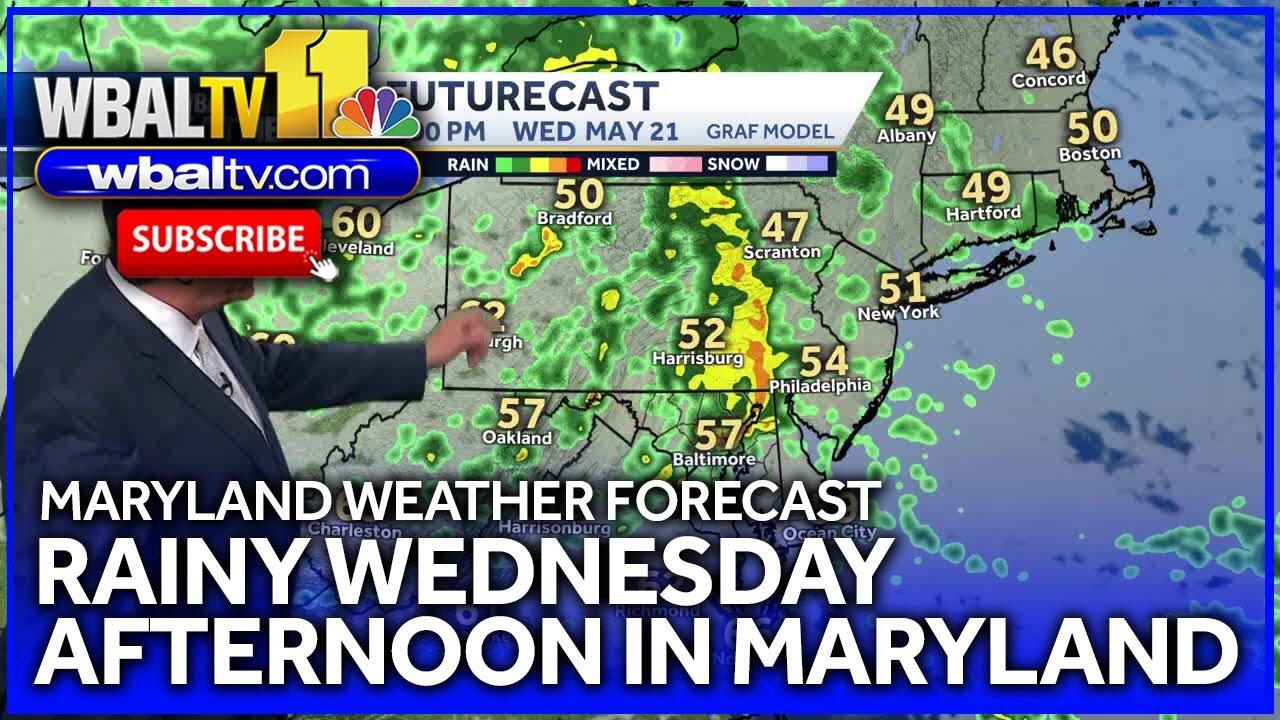 Meteorologist Tony Pann says the rain showers will continue on Wednesday with a steady breeze and cooler temps in the 50s. The showers will last overnight and through Thursday morning. It will warm up slightly but still be cooler the mid 60's before a clearer Friday with only a slight chance for more rain. The weekend will be clear and sunny, perfect for Artscape with temps reaching the low 70s both Saturday and Sunday. It will be partly cloudy but dry for Memorial Day before more showers for mid week.