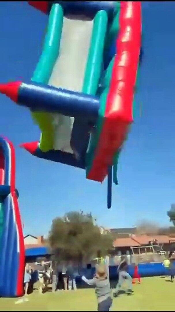 Un château gonflable s'envole avec plusieurs enfants à l'intérieur
