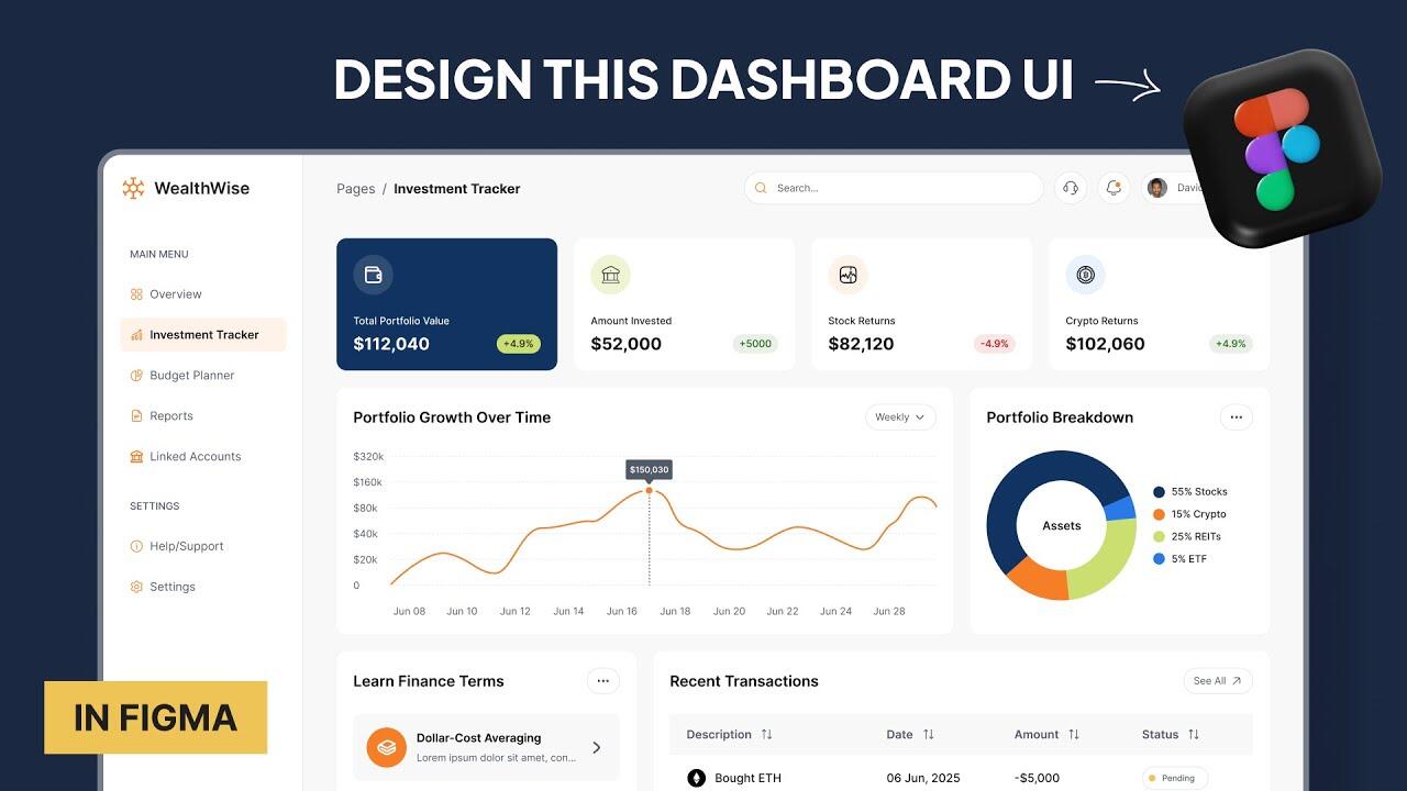 Learn how to design a clean, professional dashboard UI in Figma from start to finish. In this tutorial, we’ll create an investment tracker dashboard that shows crypto and stock performance, portfolio breakdowns.