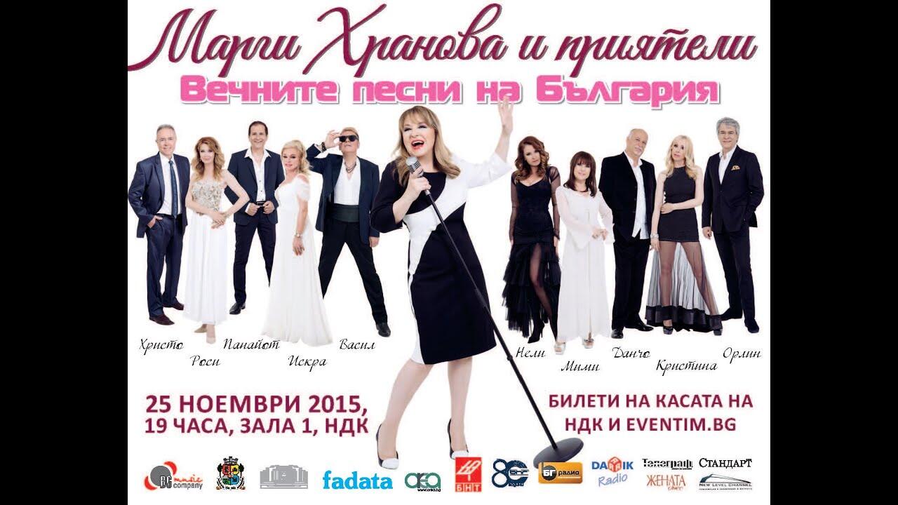 Музикална компания “БГ Мюзик къмпани” организира концерт-спектакъл - „Вечните песни на България“ на Марги Хранова. Спектакъла е почит към най-обичаните български певци и композитори, които не са между нас. В концерта са включени песни на Емил Димитров, Паша Христова, Катя Филипова, Мария Нейкова, Петър Чернев, Боян Иванов, Борис Гуджунов, Георги Минчев, Чочо Владовски и др. Специален блок от песни ще почете паметта на композиторите Найден Андреев и Борис Карадимчев. Публика ще чуе: „Ако си дал“, “Вървят ли двама“, “Незабрава“, “Една българска роза“, “Заклинание“, “Зеленоокото момиче“, “Надежда“, както и вечни хитове от репертоара на Марги Хранова по музика на Найден Андреев и Борис Карадимчев - „Устрем“, “Далечна песен“, “Албена“, “Оставаме“ и много др. В концерта ще вземат участие най-обичаните български изпълнители: Васил Найденов, Орлин Горанов, Кристина Димитрова, Роси Кирилова, Данчо Караджов, Панайот Панайотов, Мими Иванова, Нели Рангелова, Искра Радева, Христо Кидиков и др. Те ще изпълнят своите най-популярни песни: „Сбогом моя любов“, “Детски спомен“, “Учителко, целувам ти ръка“, “Може би“, “Искаш огън да ти дам“, “Петнадесет лалета“, “Мой стих“, “Добри познати“, “Хей , живот здравей“ и др. Концерта ще бъде под съпровода на Дани Милев бенд, вокална група ЛАТИДА, Левон Манукян Колегиум Музикум и смесен хор "Родна песен" Бургас.
