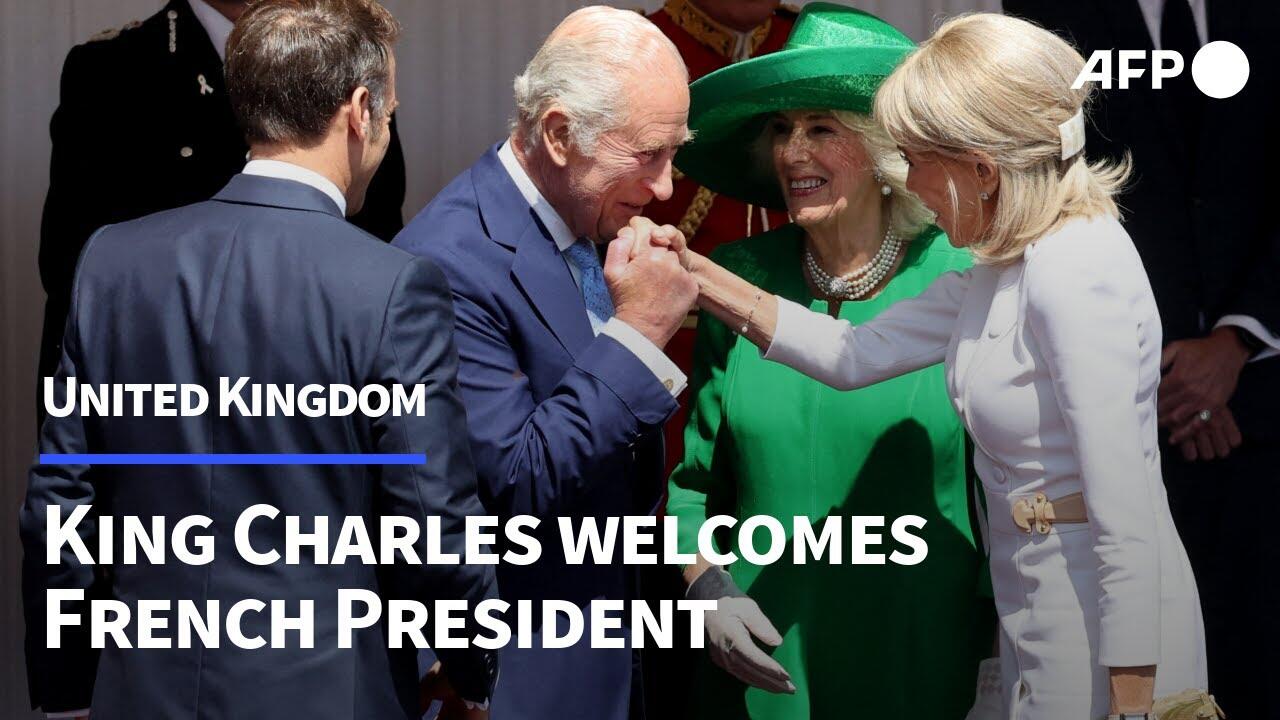 French President Emmanuel Macron and First Lady Brigitte Macron are welcomed to Windsor by King Charles and Queen Camilla, on the first day of their state visit to the UK.