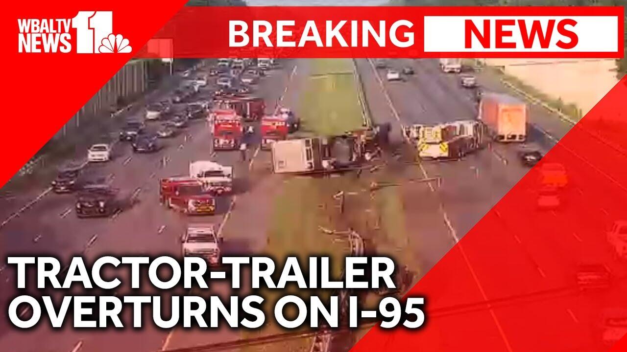 A tractor-trailer overturned Friday morning in the median of Interstate 95 in Howard County. Maryland Department of Transportation cameras showed the tractor-trailer on its side near Montgomery Road, that's between the Interstate 895 and Maryland Route 100 exits. As 7:30 a.m., CHART showed the left two lanes closed in each direction as emergency crews respond. The two right lanes were getting by the scene in each direction.