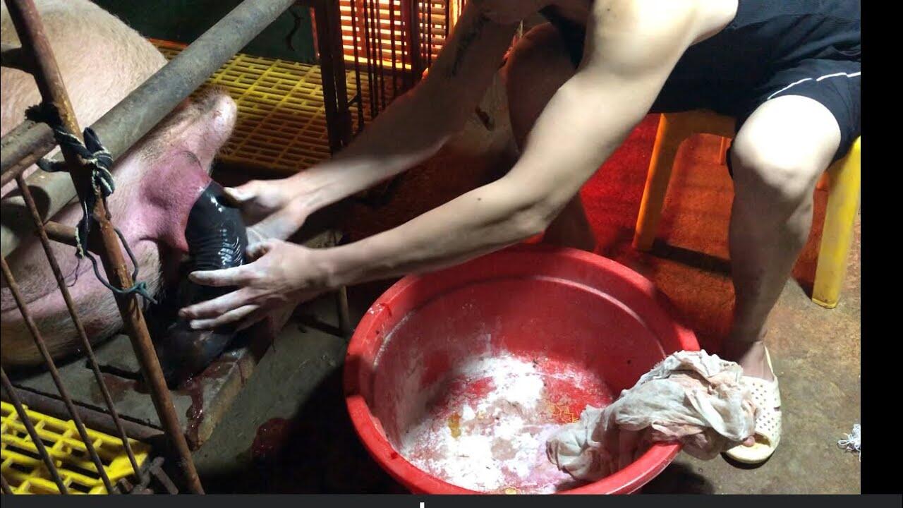 great mother pig giving birth baby