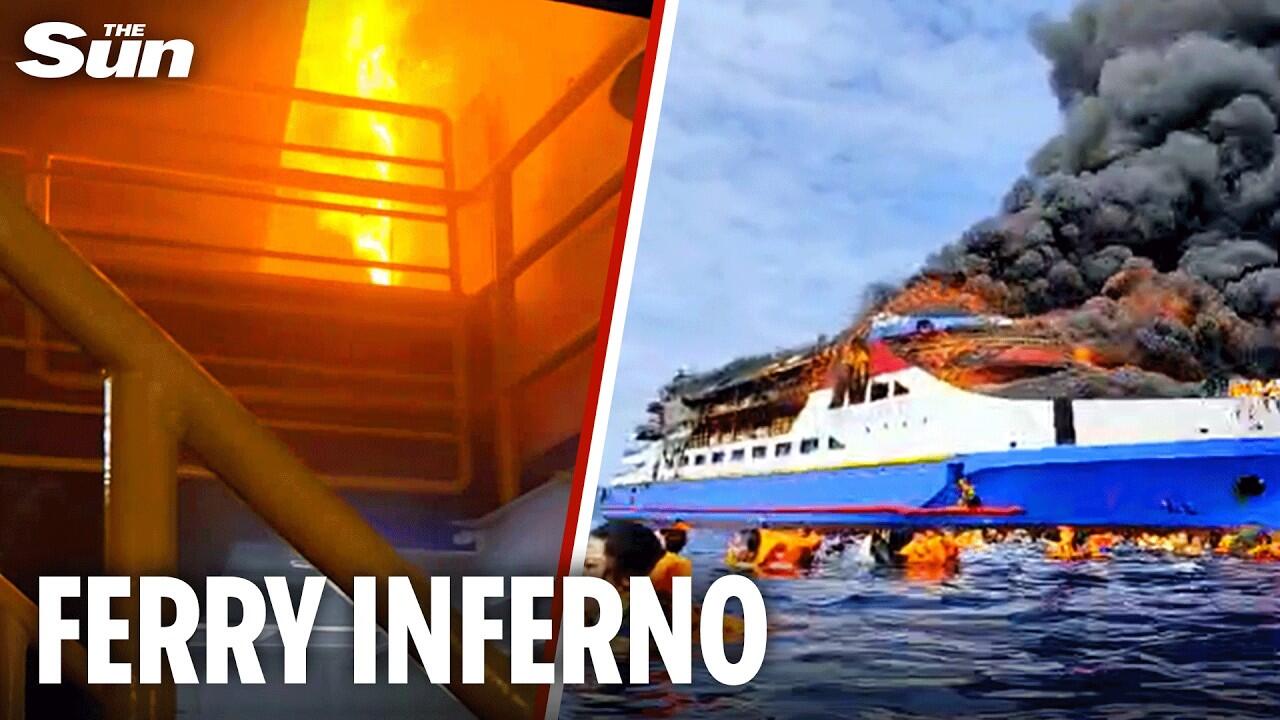 A PREGNANT woman is among at least five dead after a ferry carrying hundreds went up in flames.