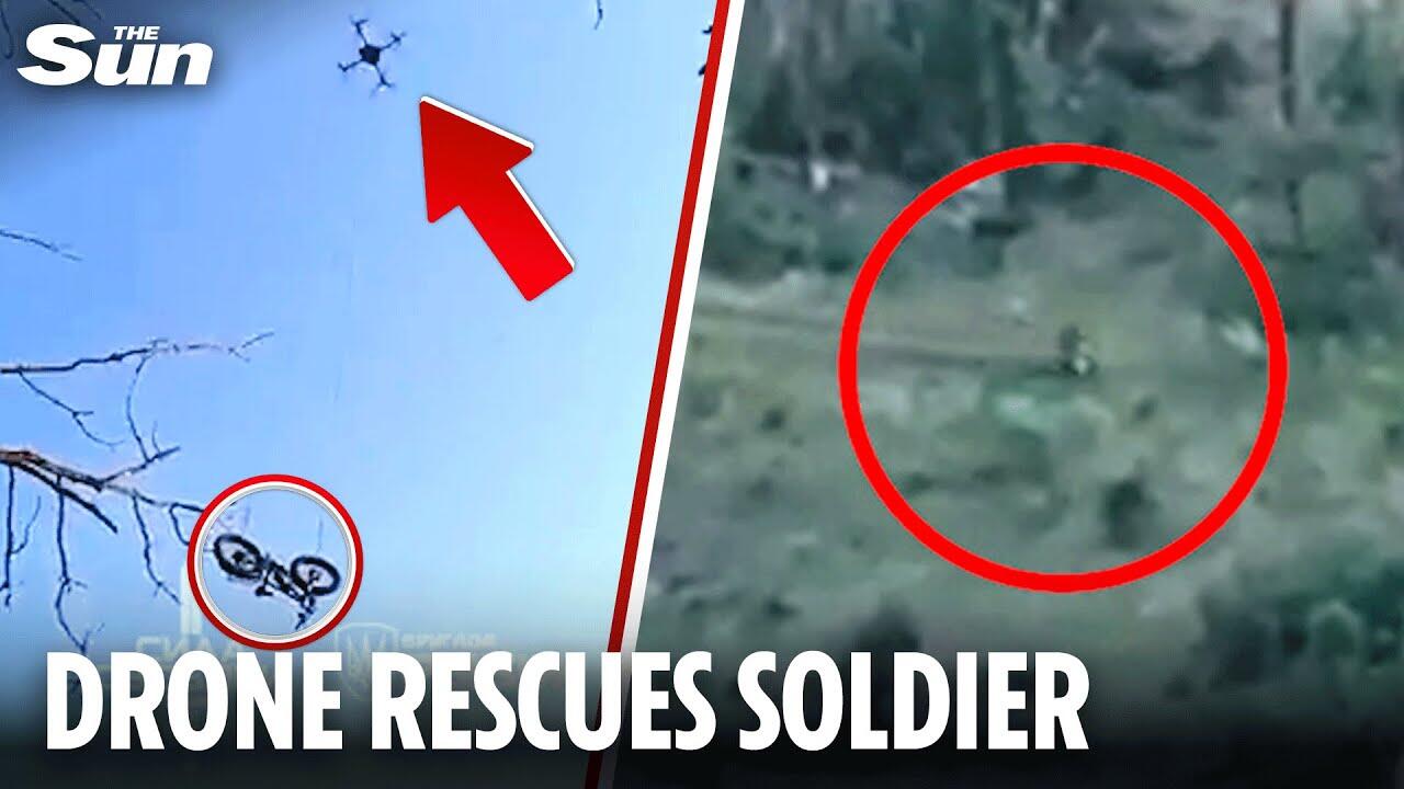 Unbelievable footage appears to show a drone slowly winching the electric bike down for the soldier, who was said to have been swarmed by Russian forces.