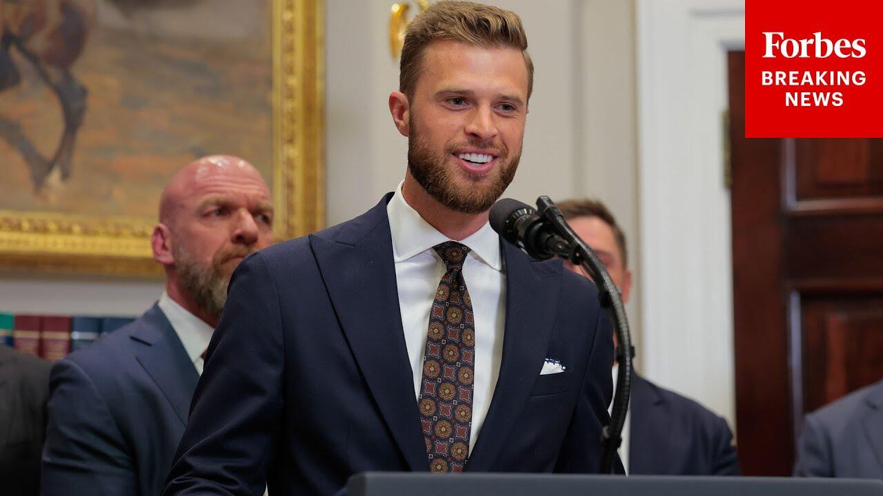 Harrison Butker speaks at President Trump's Presidential Fitness Test announcement.