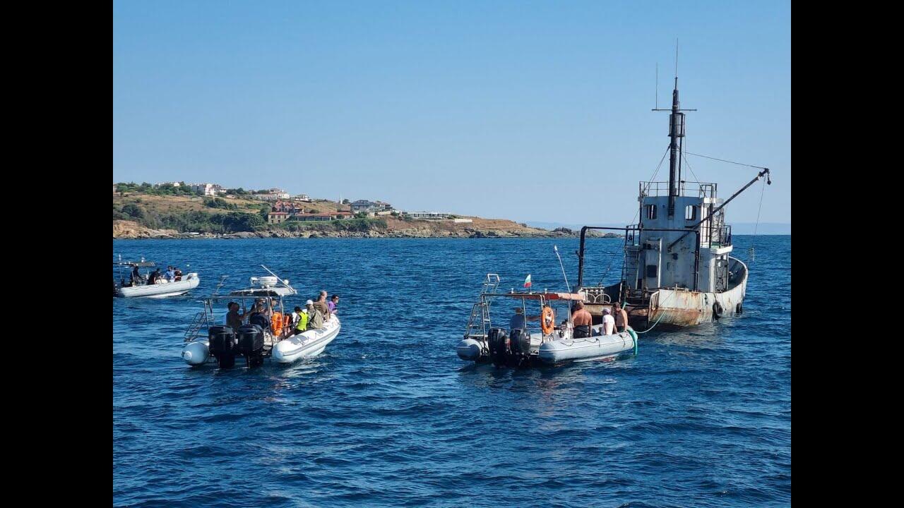 Президентът Румен Радев взе лично участие в потапянето на историческия риболовен кораб РК „Чавдар“ край бреговете на Созопол. Събитието има екологична и символична стойност – плавателният съд, служил от 1964 г., ще бъде превърнат в изкуствен риф и убежище за морския живот. | БГНЕС