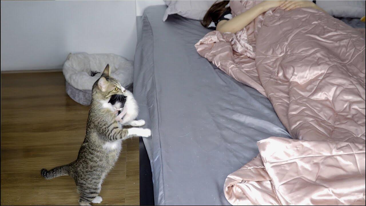 A moment of pure love between a cat mom and the person she loves most. 💛