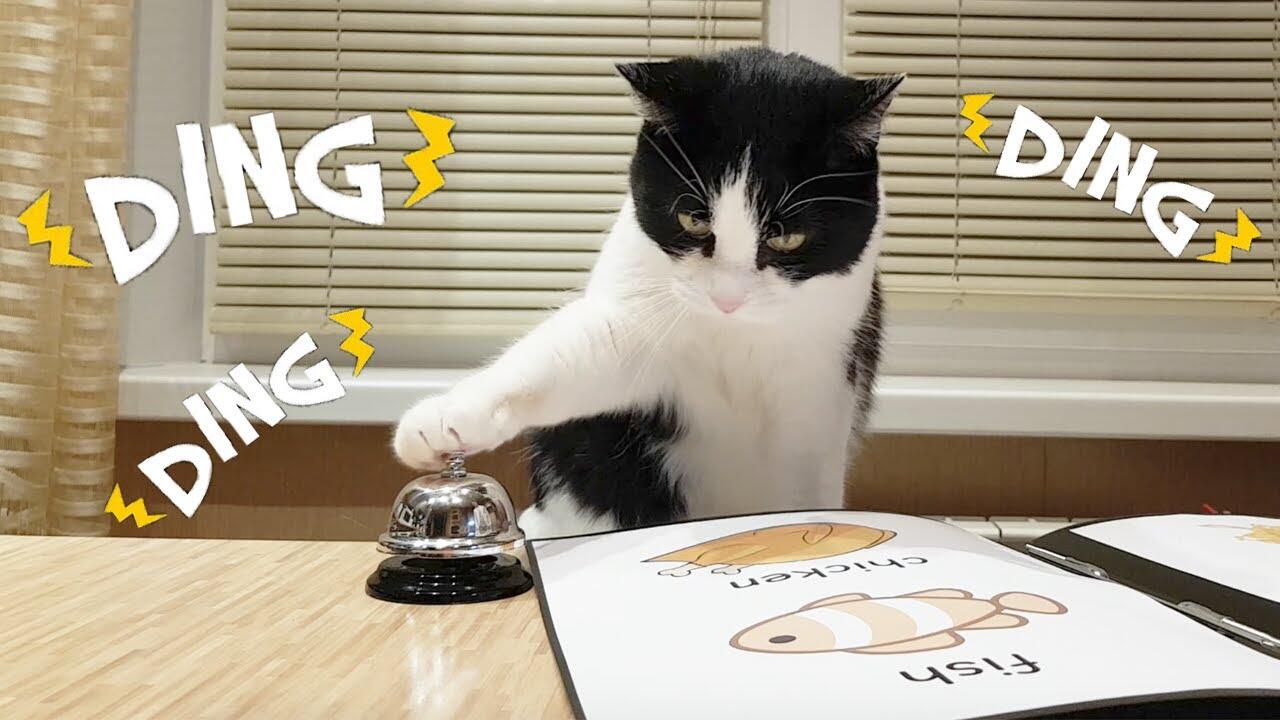 The cat demands food by ringing the bell. The waiter brings him the menu. There are four dishes to choose from: