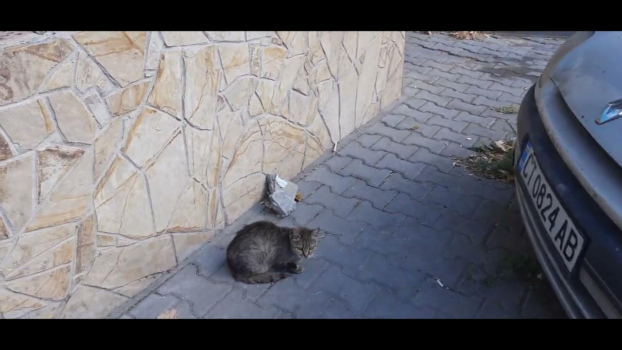 Сива котка стои пред магазин за плодове и зеленчуци