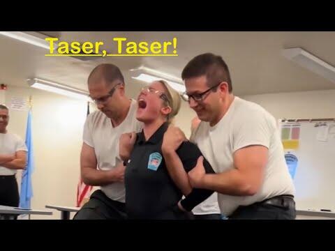 Police Academy training. Recruits volunteer to be tased so they can experience what it feels like.