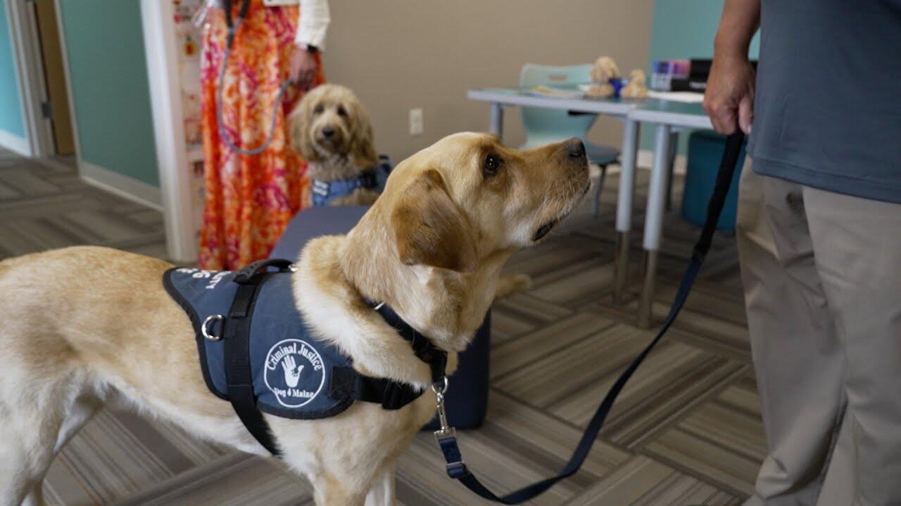 Ice and Kali are working dogs. You might not know it from their calm demeanors, but that's the point: they're trained to help young victims and witnesses make their way through the justice system in Maine. Ice's human, Paul Rucha, told Inside Edition Digital that "Ice is the chillest dog you ever want to meet," and that Ice's calming presence can help people get through very difficult situations. "Just having a dog there that you can pet lowers that anxiety level," he added.