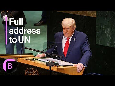 US President Donald Trump addresses the United Nations assembly as they convene their 80th meeting in New York City. He speaks about the US economy, progress on global trade deals, the war in Ukraine, Russia, India, Israel, immigration and energy policy.