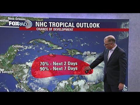 Recent satellite wind data indicate the tropical wave (Invest 98L) located over the eastern Caribbean Sea still lacks a closed circulation, but continues to produce a concentrated area of showers and thunderstorms. Compared to yesterday, surface observations suggest the circulation is gradually becoming better defined, and environmental conditions are forecast to become a little more conducive for development as the system slows its forward motion. A tropical depression or storm is now likely to form over the next day or two as it moves into the central Caribbean Sea.