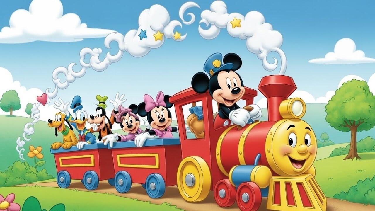 Join Mickey Mouse as he drives a colorful toy train with all his friends. Mickey is smiling, waving, and enjoying a happy ride through bright green parks, tall trees, blue skies, and a fun cartoon world.